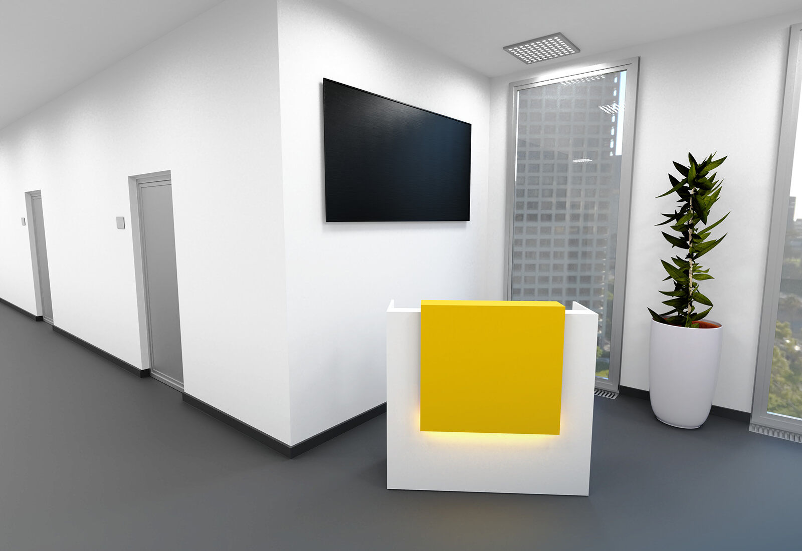 Die Empfangsablage, die nahtlos in ein individuelles Designelement übergeht, ist hier in Weiß-Gelb (80 cm x 75 cm/ RAL 1021, Rapsgelb), gehalten und eignet sich in dem sonnigen Farbton perfekt z. B. als Friseurtheke.